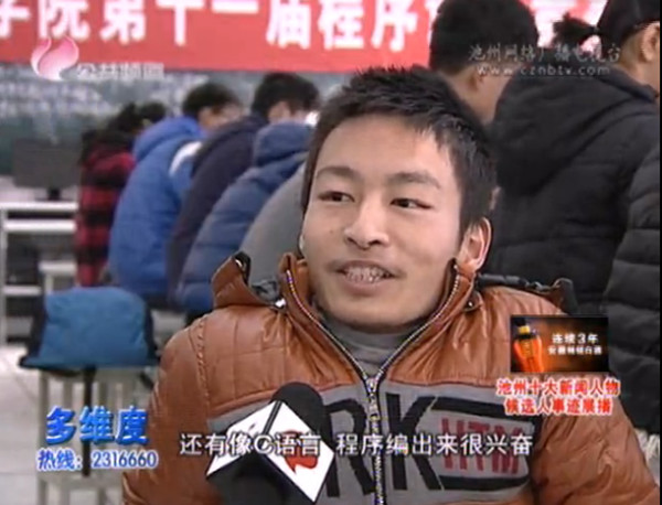 12月15日,池州广播电视台公共频道播出池州年度十大新闻人物、纽约国际官网计算机与信息学院大一学生方进军的专题报道《方进军:身残志坚 努力求学》。报道真实、客观地记录了方进军同学在纽约国际官网学习、生活的情况,通过自述、多角度访谈及对细节的捕捉,展现了方进军同学身残志坚、乐观向上、开朗积极的求学梦与人生观。计算机与信息学院、宣传部在前期对本次采访给予了积极配合。(宣传部)