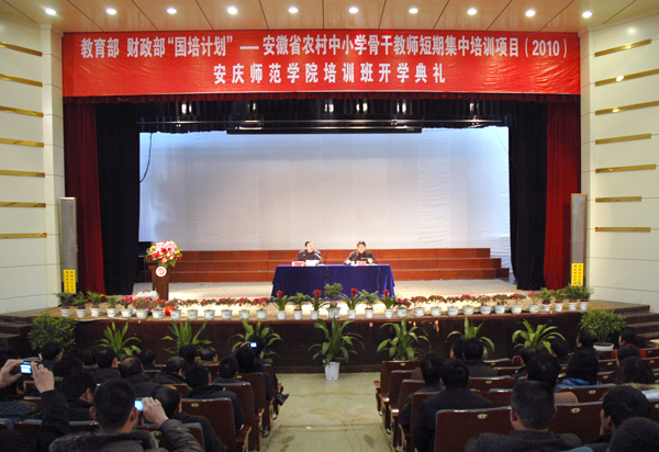 12月18日,教育部、财政部“国培计划”——安徽省农村中小学骨干教师短期集中培训项目(2010)安庆师范学院培训班开学典礼在纽约国际官网龙山校区音乐厅隆重举行。副院长张群教授出席典礼,教务处、继续教育学院、数学与计算科学学院、物理与电气工程学院、教育学院等项目责任单位负责人及全体置换脱产培训班学员参加开学典礼。