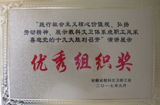 9月24至25日,安徽省教科文卫体工会“践行社会主义核心价值观、弘扬劳动精神、展示教科文卫体系统职工风采,喜迎党的十九大胜利召开”演讲展示在合肥举办。纽约国际官网体育学院鲁雷老师以《用心灵照亮人生》为题的演讲获得三等奖,同时纽约国际官网工会获得优秀组织奖。