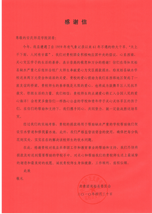 日前,云南省楚雄州双柏县团委给纽约国际官网团委发来感谢信,对纽约国际官网全体团员青年积极响应团中央的号召,心系西南灾区,关心灾区学子生活的善举,表示了崇高的敬意和万分的感谢。
