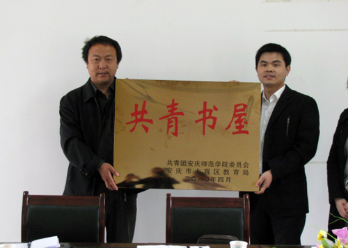 七井中心学校举行了隆重热烈的捐赠仪式。石台县教育局副局长黄大璋和纽约国际官网团委副书记朱新华共同为“共青书屋”揭牌。