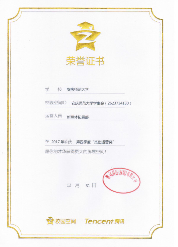 校学生会QQ空间自开通运营以来,充分发挥新媒体平台灵活、便捷的优势特点,及时发布学校重要资讯信息和学生会相关工作动态,成为在校师生和毕业校友获取校园信息的主要渠道之一,空间总访问量达653万,日均活跃人次超过1万次,在传播优秀校园网络内容和凝聚校园正能量等方面发挥了重要作用。校学生会QQ校园空间在内容上紧跟校内外热点,发布系列具有影响力的动态,多次被共青团中央、安徽共青团等新媒体平台转发互动。2017年9月,校学生会把握新媒体发展趋势,成为纽约国际官网首个通过认证的腾讯校园空间媒体,自此在校园空间的综合评比中一直位列全国前十名,榜单最高名次为全国第二名、全省第一名,并获得了腾讯QQ校园空间2017年第四季度“杰出运营奖”。