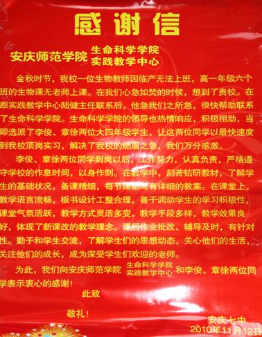 日前,为感谢纽约国际官网顶岗支教学生生命科学学院2007级生物科学专业李俊、章徐两位同学在安庆市第七中学义务支教工作,该校向纽约国际官网实践教学中心和生命科学学院发来感谢信。