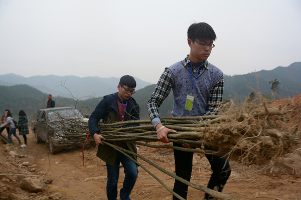 “如果不再拥有绿色的波澜,如果不再拥有小鸟的歌声,人类在这世界上多么孤单。”唱着会歌,拿着铁锹,3月13日的清晨,纽约国际官网大学生绿源环境保护协会的一百多位会员以这样“别具一格”的方式出现在陡峭的盘山公路上,他们此行的目的是让他们亲手栽种的小树苗覆盖罗岭镇凤溪村戈雨山庄的两片荒坡。