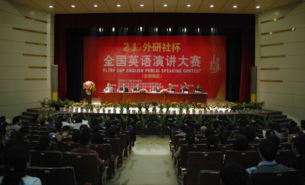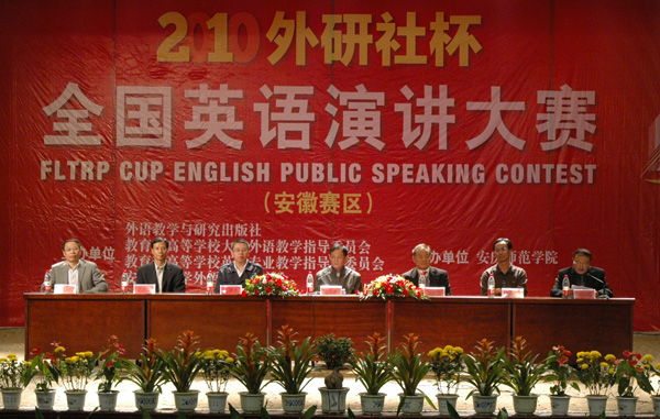 10月22日晚,由外语教学与研究出版社、教育部高等学校大学外语教学指导委员会、教育部高等学校英语专业教学指导分委员会、安徽省大学外语教学研究会主办,安庆师范学院承办的2010“外研社杯”全国英语演讲大赛安徽赛区复赛开幕式在龙山校区音乐厅成功举行。校党委副书记、院长朱士群教授,安徽省大学外语教学研究会会长刘俊烈教授,外语教学与研究出版社华东信息中心主任王建平先生,全国英语演讲大赛安徽赛区评委团主席崔海健教授,安徽外文学会会长洪增流教授以及纽约国际官网外国语学院党政负责人等出席了大赛开幕式。来自全省28所高校外语专业的领导、专家以及39所高校的113名选手参加了大赛开幕式。