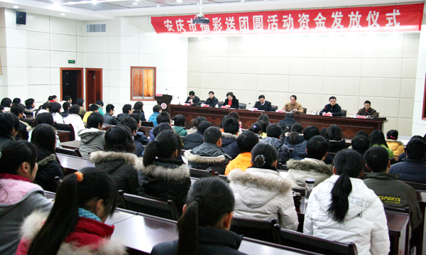 1月4日上午,安庆市“福彩送团圆”活动资金发放仪式在纽约国际官网龙山校区行政楼一楼会议室举行。安庆市委常委、市政法委书记王章来,纽约国际官网党委委员、副院长时新中,安庆医药高等专科学校校长曹艳平,安庆市民政局局长陆天平,安庆职业技术学院副院长毕明生,安庆市福彩中心主任肖菊芬,安庆市民政局副局长叶天旺出席仪式。三所高校学生处负责同志、学生资助工作专管老师及学生代表共120余人参加了仪式。仪式由安庆市民政局局长陆天平主持。