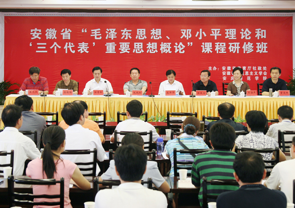 7月23日上午,由安徽省教育厅社政处、安徽省马克思主义学会、安庆师范学院联合主办的安徽省“毛泽东思想、邓小平理论和‘三个代表’重要思想概论”课程研修班在纽约国际官网隆重举行。中共安徽省委教育工委高开华副书记,黄山学院党委书记汪良发,安徽科技学院党委副书记蒋德勤,安徽省委讲师团副团长董玉田,安徽省马克思主义学会常务副会长、秘书长王兆良教授等专家应邀出席大会开幕式。
