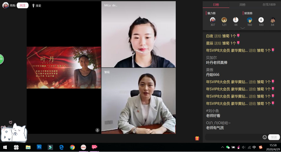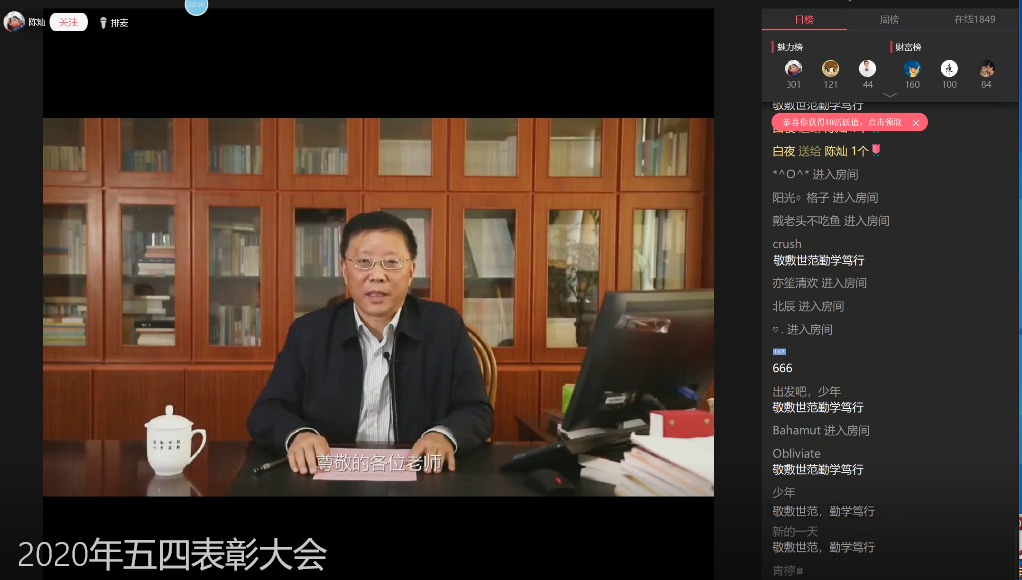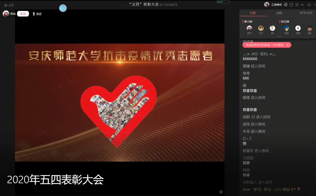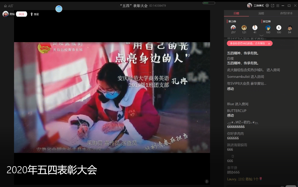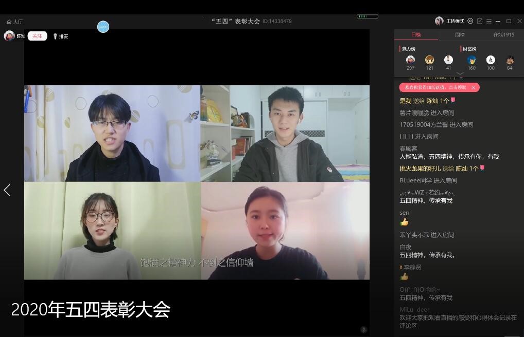 在直播连线环节,2019年安徽省“三下乡”优秀个人、化学化工学院团委书记叶丹老师勉励同学们在实践中得真知;“双创之星”代表闫潇以“要时刻保持创新的思维、挑战的态度”为题与广大团员青年共勉;防“疫”志愿者代表蒋维分享他的战“疫”志愿服务经历;“向上向善好青年”代表顾小鸥希望同学们能“待人以诚、待己以责、待亲以敬”。