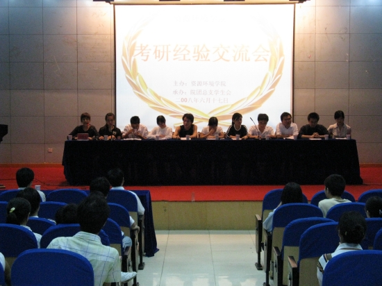 6月17日晚,由资源环境学院团总支举办的2008届毕业生考研经验交流会在菱湖校区学术报告厅举行。资源环境学院党总支书记李经田、副院长徐志兵,教师代表陈书琴、刘燕杰以及学院200多名学生参加了交流会。