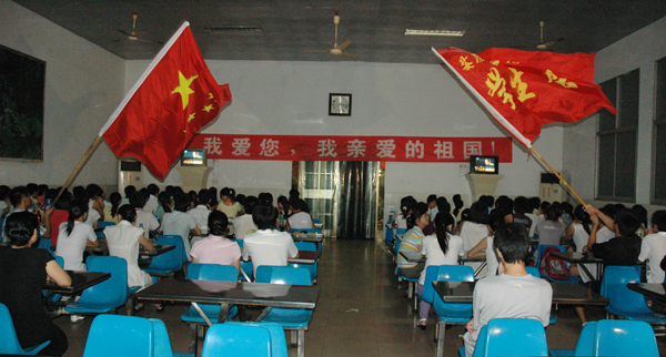 吃完晚饭,同学们就早早来到了观看地点——菱湖校区学生食堂,兴高采烈地围坐在一起讨论各自喜欢的体育项目和体育明星,表达对祖国、对奥运会的良好祝愿。文学院的李同学高兴地说:“中国女足队2比1战胜了瑞典;中国男足虽然和新西兰1比1握手言和,但也打入参加奥运会以来的首粒进球,这都是好兆头。我想,奥运健儿们一定能够在家门口所向披靡,金牌和奖牌总数都超过2004年雅典奥运会。”物理与电气工程学院的王同学说:“四年一届的奥运盛会能够在我们伟大的祖国举办,这是全国人民的一大盛事,是对改革开放30年来伟大成就的肯定。相信中国奥运健儿一定能在奥运会上取得出色的成绩,北京奥运会一定会精彩出众、取得圆满成功”。一位现场组织的老师说:“从今年年初开始,学校里‘迎奥运、促和谐’的氛围就已经非常浓厚了,各院系、各部门都举办了极具特色的迎奥运活动,师生们参与热情前所未有的高涨。今晚,期盼已久的奥运会终于来了,内心的激动难以表达。虽然我没有机会到现场亲眼目睹这一盛大场面,只能坐在电视机前观看直播,但我的心是和在场的全体同胞们、运动员们紧密联在一起的。我为他们加油、为他们喝彩!” 同学们还纷纷表示,要从自身做起,在奥运期间体现当代大学生积极健康向上的精神风貌,积极做奥运服务的志愿者、文明观赛的参与者、平安奥运的践行者、奥运理念和奥运精神的传播者,做到遵纪守法,爱护公物,文明热情观看,把爱国热情转化为刻苦学习的动力,为学校的建设和发展做出贡献。 当8点的钟声敲响,鸟巢的上空焰火四起时,同学们的情绪也达到了高潮,食堂内欢呼声沸腾了。