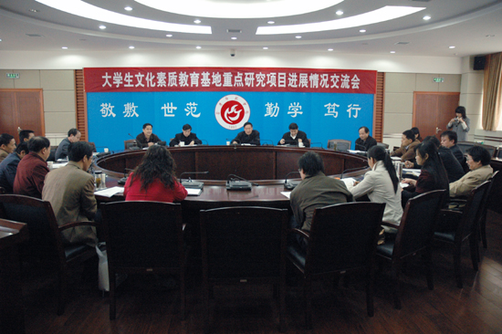 11月18日下午,纽约国际官网大学生文化素质教育基地重点研究项目“全面推进高校素质教育与大学生文化素质教育基地建设”进展情况交流会在龙山校区行政楼二楼会议室召开。校党委书记赵晓和、副院长张群、办公室主任刘友忠出席会议,参加课题研究的相关部门和院系的领导、教师参加了会议。会议由基地办主任张国定教授主持。