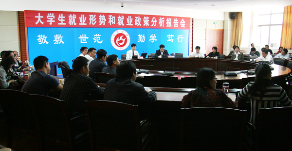 燕贵忠处长从四个方面具体分析了对当前形势下做好高校毕业生就业工作的思考。他指出,国家的要求、学校事业发展的需要、家庭和学生的要求,促使高校必须对毕业生就业工作常抓不懈。在认识毕业生就业形势时,既要看到不利因素也要看到有利条件。虽然毕业生数量增加,全球金融危机导致毕业生需求量减少,毕业生就业期望更新调整相对滞后,教育内部在学科专业结构、人才培养质量、学生就业能力等方面还存在诸多不适应经济社会发展的地方,使高校毕业生就业面临严峻的形势,但是还应看到党和政府高度重视,营造了良好的环境;经济保持适度发展,对扩大就业形成有力拉动;在全面构建和谐安徽、推进跨越式发展、实现奋力崛起的过程中,将为高校毕业生提供更多的就业空间等有利条件。燕处长还对国务院和安徽省政府的就业政策进行了梳理,并对高校毕业生就业工作提出了十点建议。他认为做好高校毕业生就业工作应该做好以下十个方面的工作:进一步落实工作责任,书记、院长应亲自抓就业;应帮助毕业生树立正确的就业观;应努力构建发展平台,提高就业创业能力;应告知学生用好政策的途径;应加强待就业毕业生的后续服务工作;应做好家庭经济困难并就业苦难学生的帮扶工作;应加强就业安全教育;应开展丰富多彩的文明离校活动;应主动跟踪毕业生就业信息,做好相关信息的统计工作;加强毕业生就业工作队伍建设,提高队伍整体水平。在报告中,燕贵忠处长对纽约国际官网毕业生就业工作在服务基层、创新机制、凝炼特色等方面的成效给予了充分肯定。