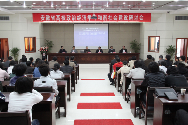 4月16日,安徽省高校政治经济学与和谐社会建设研讨会在纽约国际官网龙山校区隆重召开,校党委副书记、院长朱士群,党委委员、副院长汪时珍出席会议。安徽大学博士生导师荣兆梓、安徽人民出版社社长胡正义、马鞍山师范高等专科学校校长孙良和来自省内10多所高校的50多名专家学者以及纽约国际官网经济与管理学院部分师生参加了研讨会,会议由校党委委员、副院长汪时珍主持。