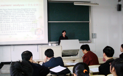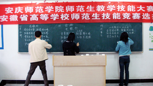 教务处按照省高校师范生教学技能竞赛组委会《关于举办安徽省高等学校首届师范生教学技能竞赛的通知》(组秘发〔2010〕3号)的要求,制定了详细的大赛方案。比赛分文理两科进行,参赛选手必须按规定完成说课(含教学设计)、多媒体课件制作及汉字书写等三方面内容。说课内容分小学、初中、高中三个层次,科目和层次由选手自选,内容提前半天随即抽取;多媒体课件制作及汉字书写内容当场随即抽取,在规定时间内完成。在三个环节中,评委们都针对选手出现的问题,进行细致的评点。