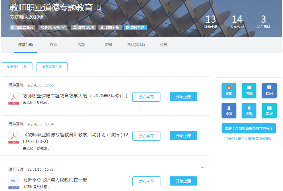 本学期,教师教育中心为了强化师范生师德主题教育与实践,加强课程团队建设,重新修订教学大纲,丰富完善教学内容,精心科学有力组织,多元全程评价考核。受新冠疫情影响,积极响应“停课不停学”号召,课程组积极建设师德教育专题网站1个,打造课堂派网络学习平台1个,组建QQ学习交流群1个,遴选班级课程助理148名、校级课程助理22名,制定了教学活动计划表、学习活动事务清单,师德单项奖评审办法,以及课程评价加分实施办法、课程补修分层实施办法等,为来自12个学院、20个师范专业、74个班级、3076名师范生的师德教育奠定了坚实的资源条件、制度规范和组织保障。课程组开展了6场线上集中学习活动指导、8场校级师德单项奖评选活动,组织了74场师德主题班会暨师德宣誓活动,举办了班级、院级和校级的师德演讲比赛87场,收集了3046篇师德主题征文。经过综合评价,本学期师德课程期末考核总评一次性及格率达98.1%,其中优秀率达30.9%。