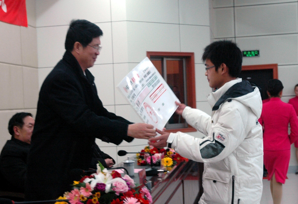 获助学生代表从程华曙董事长手中接过了捐赠牌。
