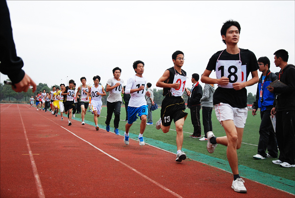 这是武俊第一次参加10000米长跑的比赛。在赛程的后半段,他体力明显不支,呼吸急促,与前面得运动员距离越拉越大,不断被赶超。奔跑的过程中有人放弃了,有人倒下了,武俊的步子也渐渐飘了起来,脚下一滑险些被绊倒。“武俊,加油!你一定行的。”在赛道的内侧,几个室友不断地替他打气。他咧着嘴,吃力地迈着每一步。在最后冲过终点的那一刻,全场沸腾了,在看台上站起身来来为他欢呼。“看到这么多的人为我加油,很受鼓舞,这给了我坚持跑下来的动力。”武俊说。