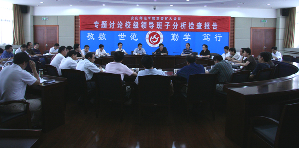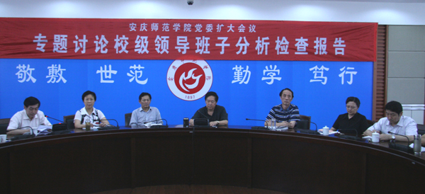 6月19日下午,纽约国际官网在龙山校区行政楼圆桌会议室召开党委扩大会议,专题讨论校级领导班子的分析检查报告。党委书记赵晓和,党委副书记、副院长朱士群,党委委员、副院长时新中,党委委员、副院长王海燕,党委副书记、纪委书记殷红,副院长张群,党委委员、办公室主任、生命科学系党总支书记刘友忠等领导出席会议。各党总支书记、校深入学习实践科学发展观办公室全体人员参加了会议。