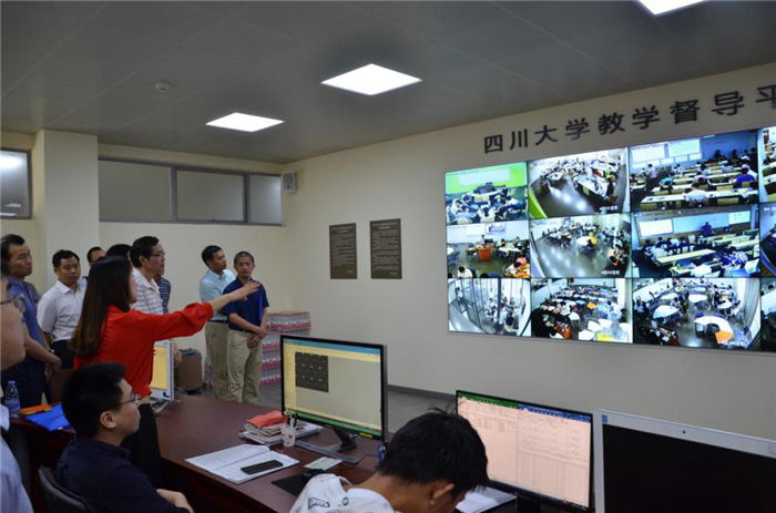 4月26日,调研组一行来到四川大学,教务处副处长冉桂琼在主教学楼网络互动教室为大家详细报告了具有四川大学特色的一流本科教育教学管理的相关举措。会后,调研组一行参观了四川大学各类智慧教室等,重点参观了四川大学教学督导平台和国家级教学成果奖展厅。