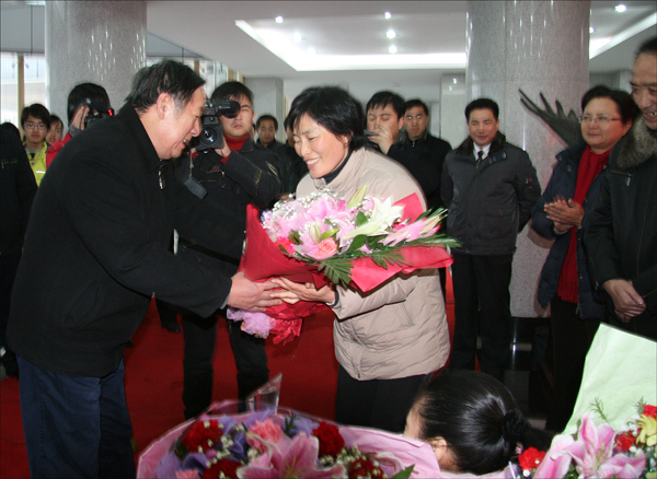 12月15日下午4:00,在纽约国际官网行政楼一楼大厅,学校全体领导,院办、教务处、学生处、招就处、团委等部门主要负责同志和上百名学生代表齐聚一堂欢迎载誉归来的纽约国际官网参赛代表团。欢迎仪式由副院长张群主持,党委副书记、副院长朱士群致欢迎词,党委书记赵晓和为刘璟和她妈妈敬献鲜花。