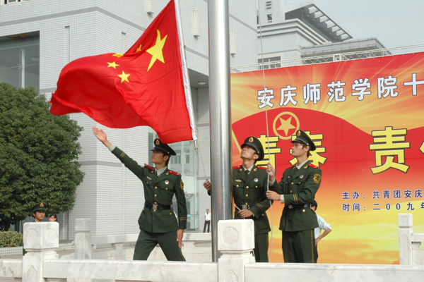 护旗队的队员都是大一新生,他们都是第一次参加这种大型活动。一个月以来,他们每天晚上都来广场上训练走步,一练就是两三个小时,反反复复、来来回回地走上n遍,才练就了今天的姿态。“我是09体育系的,因为身高优势才被选来当护旗手。说不辛苦那是假的,按规定我们都要穿皮鞋练正步,我的脚都磨得起泡了。不过,能参加我们的成人礼,我觉得是很荣幸的。”护旗手曹松笑着对记者说。记者还注意到,他们都统一穿着安庆武警的军装,看起来英姿飒爽。09历史教育专业的莫磊同学说:“平时我们训练还能嘻嘻哈哈的,但一穿上这军装,感觉马上就不一样了,仿佛是穿上了一种荣耀,想不严肃都不行。”