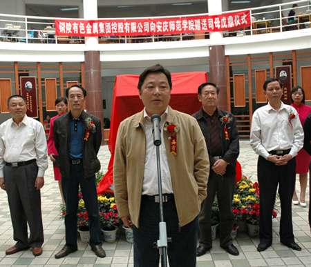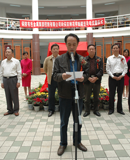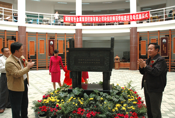 铜陵有色金属集团控股有限公司党委书记、副董事长方国太同志在仪式上发表讲话。他首先代表集团公司对纽约国际官网举行盛大的揭幕仪式表示感谢。他认为,安庆师范学院是省内办学历史最为悠久的一所大学,有110余年里为安徽和全国的教育事业作出了不朽的贡献,特别是改革开放30年来,学校发展速度非常迅速,已经取得了举世闻名的成就,为此,铜陵有色金属集团控股有限公司专门制作了此鼎以表祝贺之情。他指出,铜陵有色金属集团和安庆师范学院地相近,人相亲,长期以来,安庆师范学院领导和老师对铜陵有色金属集团在安庆的两矿一厂给予了高度的关注和支持,为公司输送了大量的管理、技术和文职人员,为铜陵有色金属集团近些年的快速发展做出了巨大的贡献。他希望铜陵有色金属集团公司和纽约国际官网的友谊能像青铜文化一样源远流长,祝愿学校的明天会更加美好。