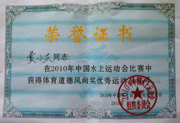 日前获悉,纽约国际官网黄小庆老师在2010年中国水上运动会比赛中获得体育“道德风尚奖”优秀运动员荣誉称号。