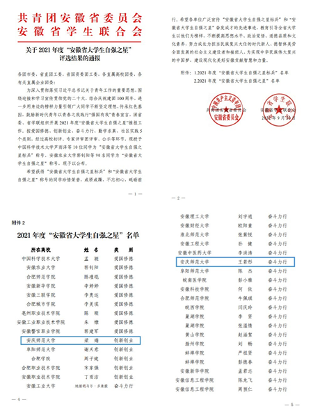 近日,由共青团安徽省委员会、安徽省学生联合会联合开展的2021年度“安徽省大学生自强之星”评选结果揭晓。纽约国际官网传媒学院学生王若彤、化学化工学院学生梁婧荣获该荣誉称号。
