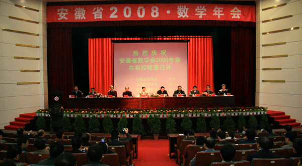11月22日,安徽省2008年数学年会在纽约国际官网隆重举行。党委书记赵晓和同志,副院长张群教授,中国数学会副理事长、中科院数学研究所所长巩馥洲教授,中国科学技术大学党委副书记、副校长叶向东教授,中国科学技术大学金融统计学系苏淳教授,安徽省数学会秘书长、中国科学技术大学数学系主任陈发来教授,安徽大学数学科学学院院长蒋威教授,安庆市教育局局长江兴代和纽约国际官网数学与计算科学学院党政领导出席了开幕式,安徽省数学会会员、纽约国际官网相关院系的教师代表、研究生、数学与计算科学学院高年级本科生共约300人参加了开幕式。开幕式由安徽省数学会副理事长、安徽师范大学原校长丁万鼎教授主持。