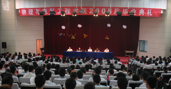 6月20日上午,物理与电气工程学院2008届毕业典礼在逸夫图书馆东报告厅隆重举行。校党委副书记、院长汪青松教授出席毕业典礼并作了重要讲话。物理与电气工程学院党政领导、教师代表、毕业班辅导员、全体毕业生以及学生代表共440余人参加了毕业典礼。毕业典礼由该院党总支副书记吴昭方同志主持。