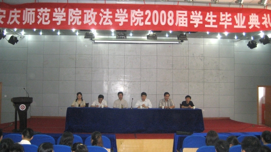 在毕业典礼上,汪院长发表重要讲话。他说,我代表学校党政班子和全体教师向文学院2008届毕业生顺利毕业表示热烈祝贺。他充分肯定了文学院近几年的工作,并给予高度的赞扬,他说:文学院为学校的发展作出了突出的贡献,有重点学科、硕士点、教学名师、国家项目等等,培养了一批卓越的人才,在安徽省内有重要的影响,在国内都有一定的影响,我为在座的同学能在文学院学习感到幸运,同时也代表学校向文学院和文学院2008届毕业生为学校发展所做的贡献表示感谢。同时,他也代表学校对毕业生提出三点希望:一是在今后的人生征途上要充满信心,追求卓越;二是在今后的工作中继续发扬安庆师范学院和文学院惯有的精神和品质;三是希望同学们不仅要好好工作,更要好好做人。最后,他以一副对联“学堂学府育学子,龙山龙水育龙人”表达对文学院2008届毕业生的赞许和期望。