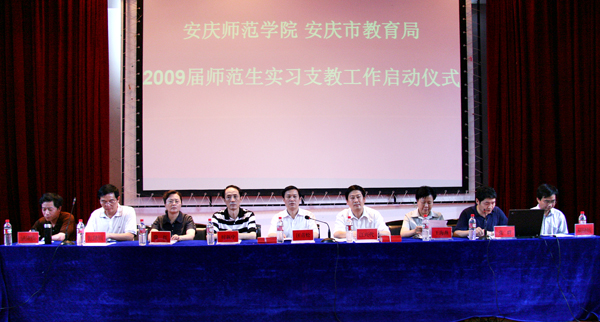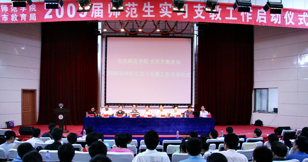 7月4日下午,安庆师范学院、安庆市教育局2009届师范生实习支教工作启动仪式在纽约国际官网龙山校区图书馆东报告厅隆重举行。纽约国际官网党政领导汪青松、时新中、王海燕、殷红、张群,安庆市教育局局长江兴代,人事科科长吴庆祥及望江、枞阳、岳西等三县教育局局长等出席启动仪式。教务处、教师专业发展中心、财务处、学生处、人事处、团委、各院系相关负责人及参加2009届实习支教的324名同学参加了启动仪式。启动仪式由副院长张群主持。