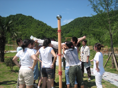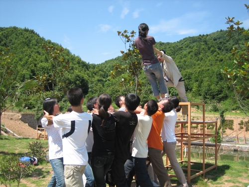拓展训练中,教练将学员随机分为二队。各队在15分钟内通过民主选举的方式选出了队长、副队长、安全员和宣传员,并为本队制定了队歌、口号、队标及对外展示的队型,同时各队的队长、副队长、安全员和宣传员既兴作了就职演讲。各队以队为单位轮流参加了生死电网和信任背摔的训练。学员们头顶着烈日,脚踏着热土,面对着训练任务的困难和挑战,他们选择的不是逃避,而是挥汗如雨、团结合作和奋力拼搏,最终,各队都完满的完成了当天的拓展训练任务。