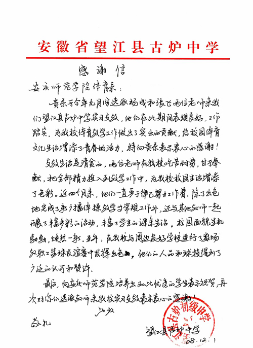 近日,纽约国际官网体育系收到了一封来自望江县古炉中学的感谢信。在信中,古炉中学对纽约国际官网实习支教学生张飞和杨成的实习支教工作给予了高度评价,并感谢纽约国际官网在推进基础教育中做出的贡献,感谢纽约国际官网支教学生在条件艰苦的基础教育第一线以高度的责任感,认真积极地实施体育教学,工作扎扎实实,将自己的所学无私奉献给当地农村教育,让当地学生学到新知识、真本领,为农村校园体育注入了生机与活力。