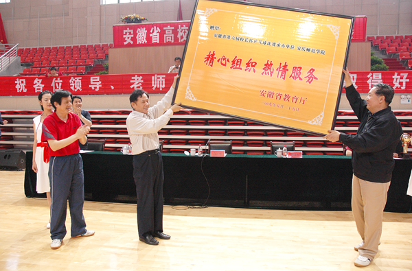 在经过两天半的紧张角逐后,5月25日中午,安徽省高校第六届“校长杯”乒乓球赛在纽约国际官网龙山校区体育馆隆重闭幕。省委教育工委副书记高开华,省政协常委、纽约国际官网党委书记赵晓和,校党委副书记、副院长朱士群,筹委会总裁判长李燕,筹委会副主任、副院长张群等领导出席仪式并在主席台就坐。 副院长时新中、王海燕,党委副书记、纪委书记殷红,副院长闵永新和来自全省42所高校的部分校领导出席闭幕式。张群副院长主持闭幕式。