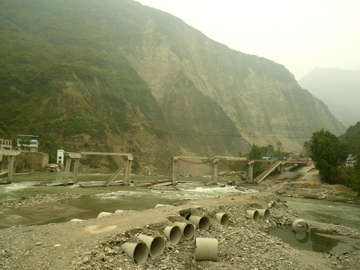 灾区地震中毁坏的桥梁和滑坡的山体