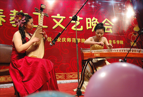 晚会在轻快活泼的舞蹈《欢天喜地秧歌情》中拉开了序幕。自编自演的快板《龙山读书声》,表达了对学校的赞美和无限热爱。男女声小合唱《美丽人间》,抒发了离退休老同志对学校的深厚感情和美好祝愿。激情的拉丁舞、浓郁民族风情的琵琶古筝合奏《彝族舞曲》、欢快的黄梅戏《七仙女赞后勤》、高昂激情的男声独唱《今夜无人入睡》……精彩刺激的杂技《对手顶碗》引爆了全场的热情,赢得了热烈喝采。国家一级演员、黄梅剧艺术学院兼职教授李萍,国家二级演员、黄梅剧艺术学院兼职副教授潘启才带来了经典的黄梅戏《十五的月亮为谁圆》、《树上的鸟儿成双对》,让大家大饱耳福。