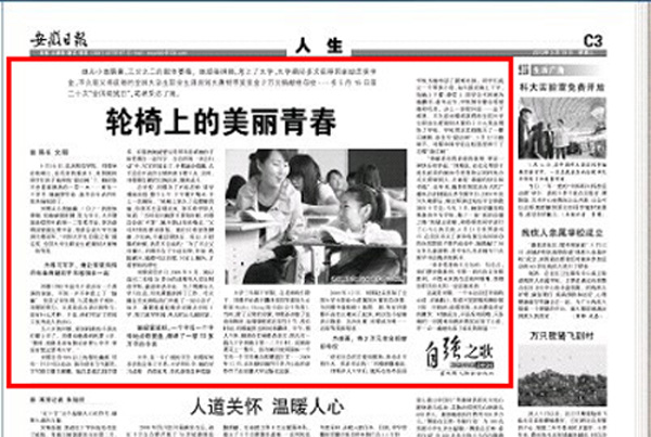 5月19日,《安徽日报》C3人生版头条大篇幅刊登了由党委宣传部陈东同志采写的纽约国际官网学子刘璟事迹——《轮椅上的美丽青春》一文。