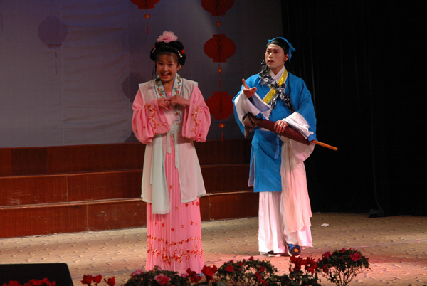 晚会上,纽约国际官网历史系87级校友代表,池州市人民政府副秘书长周啸虎走上舞台表达了对母校的感恩之情:“多少年来,师恩时刻荡漾在心头,母校也让人魂牵梦绕。借此机会,感谢母校的栽培之恩,感谢母校对广大莘莘学子的牵挂,更感谢母校今天对学子的召唤。在今后的日子里,我们将努力的工作,用我们的实际行动来回报母校。祝愿母校明天越来越美好,老师们身体健康,桃李满天下!”他与纽约国际官网黄梅戏表演专业学生共同演唱了黄梅戏选段《果然喜从天上降》。