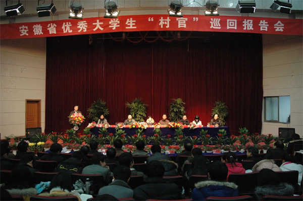 副院长时新中在报告会上发表讲话,他指出,选聘高校毕业生到农村任职是党中央作出的一项重大战略决策。安徽省委、省政府高度重视,从2008年起,先后分三批共选聘2400多名大学生村官,在他们中间已经涌现出一大批勇于开拓,肯于吃苦,踏实干事的先进典型。举办巡回报告会,是为了让更多的在校大学生了解大学生村官工作政策,在更大范围内宣传安徽省优秀大学生村官的先进事迹,鼓励和引导更多优秀高校毕业生投身大学生村官队伍,进一步提高我省大学生村官队伍的整体质量和水平。参加巡回报告会的大学生村官是全省2400多名大学生村官中的优秀代表,他们克服困难、扎根基层,把人生选择融入党和人民的事业,为社会主义新农村建设奉献青春和智慧,这种无私奉献、造福人民的高尚品质,值得每一位在校大学生学习。