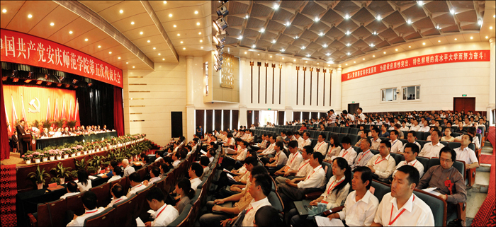 5月19日上午,安庆师范学院龙山校区彩旗飘扬,音乐厅内气氛隆重而热烈,主席台正上方悬挂着“中国共产党安庆师范学院第五次代表大会”的大幅会标,鲜艳的红旗簇拥着由镰刀和锤子组成的党徽,主席台前摆放着盛开的鲜花,中国共产党安庆师范学院第五次代表大会在这里隆重召开。