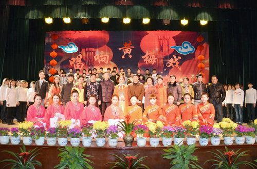在每个学期结束的时候,《黄梅戏艺术欣赏与演唱》都会安排公选课学生与黄梅戏专业学生、大学生黄梅剧艺术团成员共同参与汇演晚会,从开设至今就一直坚持这种做法。现在,这台晚会已经成为了这门课程的一大特色,真正是把黄梅戏的教学从教室搬上了舞台。