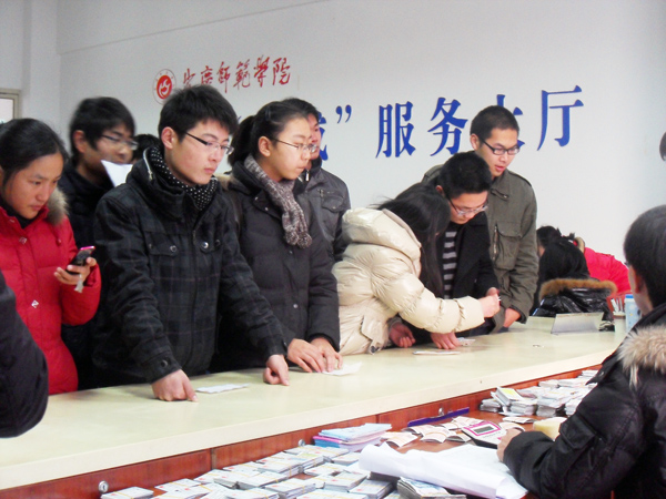 伴随着2012年春运的来临,火车站又要求用实名制购票,同学们发愁了:是放弃宝贵的复习时间去车站排长队买票,还是……,2011年12月中旬,同学们得到一个好消息:学生“四成”服务大厅像往年一样免费为同学们代购火车票。为了做好这件事,学生“四成”服务大厅学生工作助理在学生处老师指导下,先和火车站联系购票日期,把学生身份证收上来,做好标记,妥善保存好,在购票的那几天,带上学生的身份证到火车站购票,回来后再对照标记分发给每位同学。整个庞杂的过程在大厅全体工作人员的努力下,没有出一点差错,为2500多名学生购买了火车票。“没想到会收到这么多同学的感谢短信,我感到很欣慰,觉得这么多天的忙,值了”,火车票代购负责人胡华东同学憨厚地笑了。