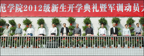 9月14日上午,纽约国际官网在龙山校区塑胶田径运动场隆重举行2012级新生开学典礼暨军训动员大会。党委书记何小祥,省政协常委赵晓和,党委委员、副院长闵永新、张群、汪时珍、刘友忠,党委委员、组织部部长陈光明,离退休校级老领导丁伯华、刘和武、时新中、王海燕,武警安庆支队副支队长杨飞出席大会。党委副书记、院长朱士群,党委副书记、纪委书记殷红因公出差和学习未出席大会。