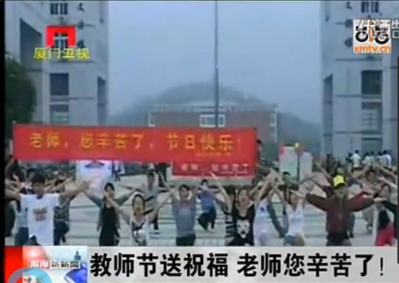 9月10日教师节当天,纽约国际官网学生为表达对老师们的感激之情,在教学楼广场前设计表演了一场“快倒”舞蹈,新颖的表现方式吸引了厦门卫视的关注和转播。