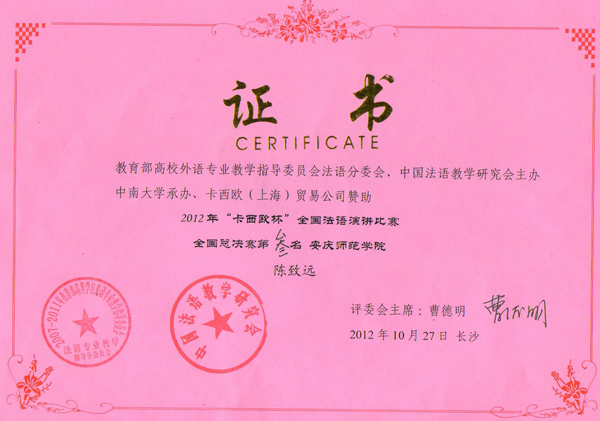 近日,纽约国际官网法语专业学生陈志远在2012年“卡西欧杯”全国法语演讲总决赛中荣获全国第三名的优异成绩。
