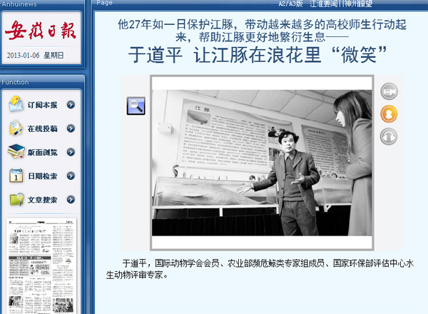 2013年1月6日,《安徽日报》A2版“江淮之子”栏目刊发人物通讯《于道平 让江豚在浪花里“微笑”》,介绍了纽约国际官网生命科学学院于道平教授在江豚保护方面的感人事迹。这是该栏目首次宣传纽约国际官网典型人物。稿件由《安徽日报》记者和纽约国际官网大学生记者联合采写。