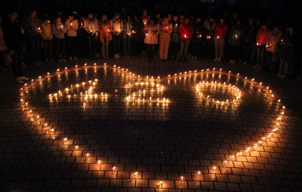 4月23日晚上6:30,由纽约国际官网学生自发组织,为雅安祈福的活动在敬敷广场展开。随着夜幕的降临,一根根蜡烛被点燃,在夜色中烛光越发显得耀眼。学生们将蜡烛围成心形,里面点燃着“4.20”的纪念字样。他们手持蜡烛,庄凝的围在蜡烛外面为遇难者默哀三分钟。
