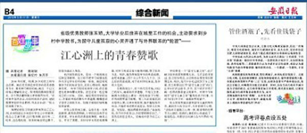 5月17日,《安徽日报》B4版头条以《江心洲上的青春赞歌》为题报道了纽约国际官网学生记者采写的2010届优秀毕业生张玉娇扎根农村教育的事迹新闻稿。