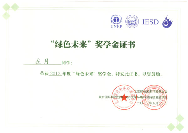 近日,从“国际学生环境与可持续发展大会”上传来喜讯,纽约国际官网资源环境学院学生左月同学获得“2012绿色未来”奖。由联合国环境规划署、同济大学联合举办的“国际学生环境与可持续发展大会” 于6月5-8日在同济大学召开,纽约国际官网资源环境学院学生左月同学作为全国20名“2012绿色未来”奖学金获得者代表赴上海参会。